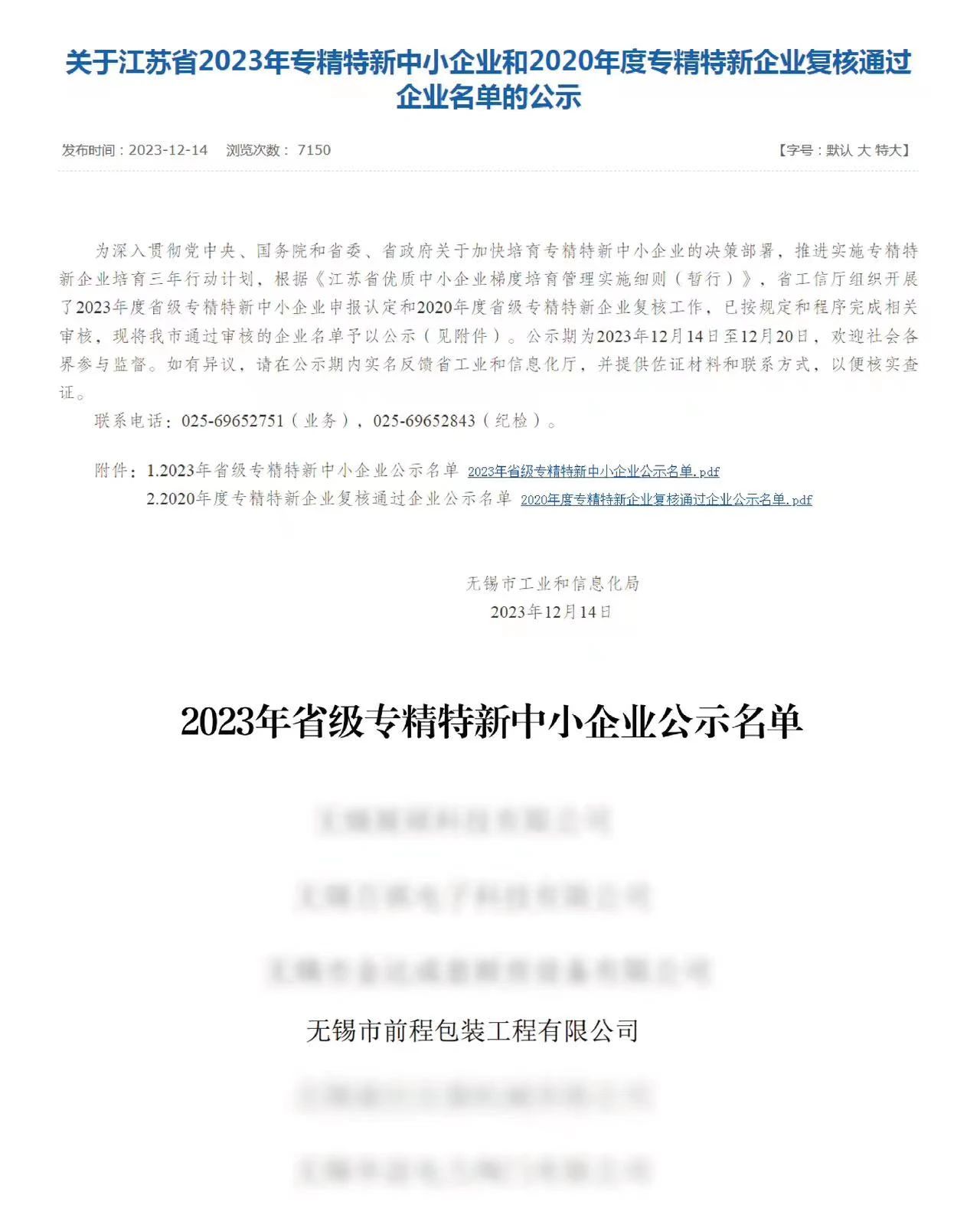 近日,無(wú)錫市工業(yè)和信息化局發(fā)布了《關(guān)于江蘇省2023年專(zhuān)精特新中小企業(yè)和2020年度專(zhuān)精特新企業(yè)復(fù)核通過(guò)企業(yè)名單的公示》,前程公司從眾多申報(bào)的企業(yè)中脫穎而出,被認(rèn)定為江蘇省“專(zhuān)精特新”企業(yè)。